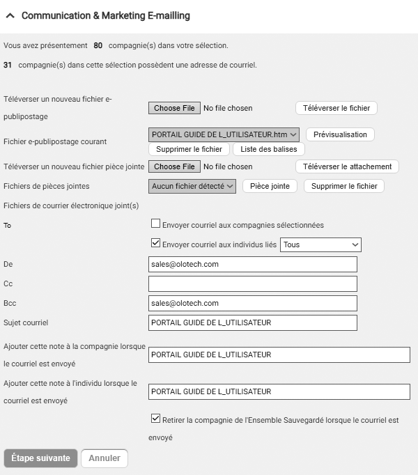 Tous les documents peuvent être envoyés par courriel personnalisé en utilisant des gabarits qui incluent l'information du client (nom, adresse). Des courriels de promotion personnalisée peuvent également être envoyé au client, ces courriel HTML peuvent inclure des graphiques, des lien diverses et des attachements.
